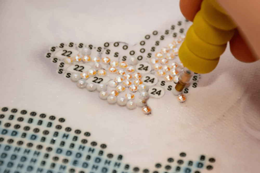 Sie können die Diamanten dann aufnehmen, da sie leicht an der Spitze des Applikators haften bleiben. Drücken Sie den Diamanten nach dem Aufnehmen vorsichtig auf das entsprechende Symbol auf der Leinwand.